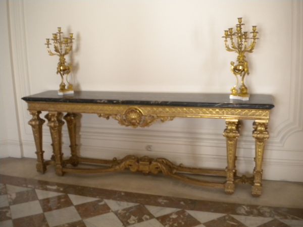 Huit pieds sculptés en gaine, au dessus des sabots sculptés, bague surmontée d'un culot de feuilles nervées. Au sommet, après une bague rectangulaire saillante sculptée d'acanthe, un culot évasé de feuilles nervées. Les pieds sont reliés entre eux par les traverses d'entrejambes dans le sens de la profondeur quatre aux deux extrémités bordées listel fond creux à grosse fleur au milieu, et quatre centrales partant des quatre pieds intérieurs, se terminant chacune en grosse volute sculptée d'acanthe reliées entre elles par un dé surmonté d'une grosse fleur. Ceinture entièrement sculptée d'un quadrillé à fleurettes, à l'axe grosse coquille sur rinceaux d'acanthe. Dessus marbre noir veiné beige.