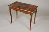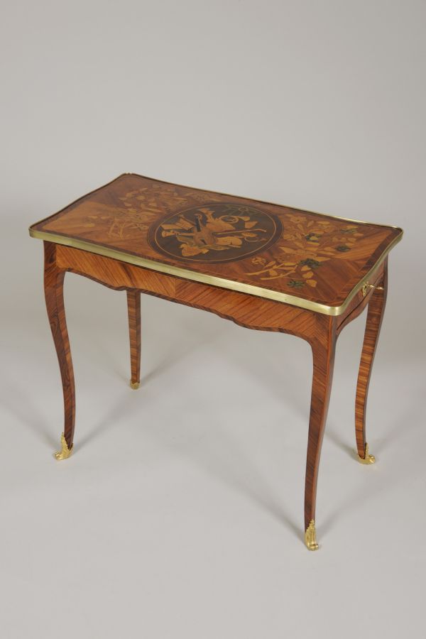 Table de décharge en bois de violette et bronze doré avec quatre pieds galbés, sabots de bronze à feuille d'acanthe. Ceinture galbée et chantournée à un tiroir sur le côté droit, entrée de serrure au motif de feuille ciselé. Plateau à moulure de bronze. Dessus en marqueterie avec, entre des branches de fleurs, un médaillon à instruments de musique.