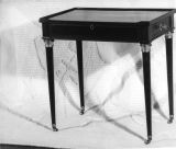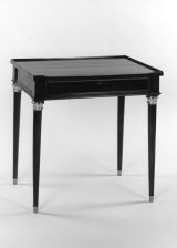 Pieds tournés en gaine montés sur roulettes, sabot bronze. Dans la partie supérieure du pied, bague de bronze à frise perlée. Ceinture rectangulaire bordée de lsitels et coins saillants.