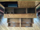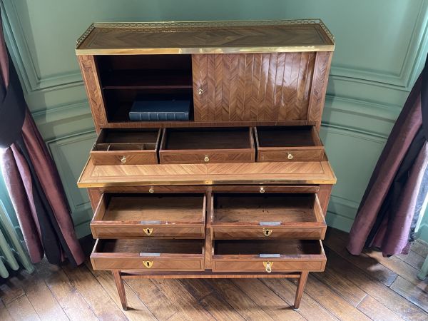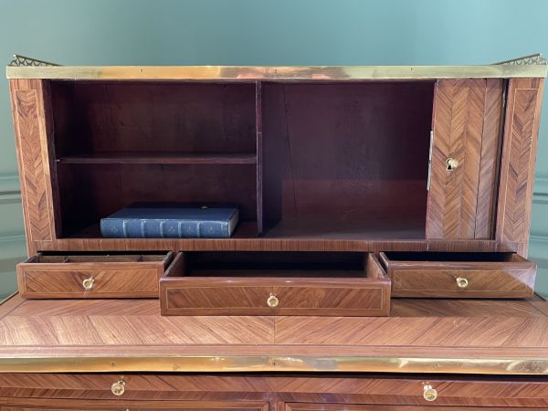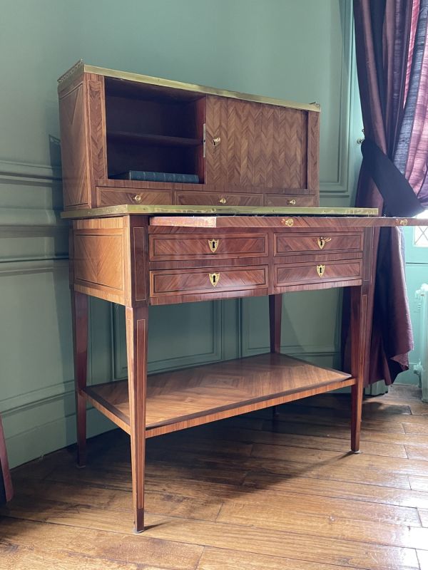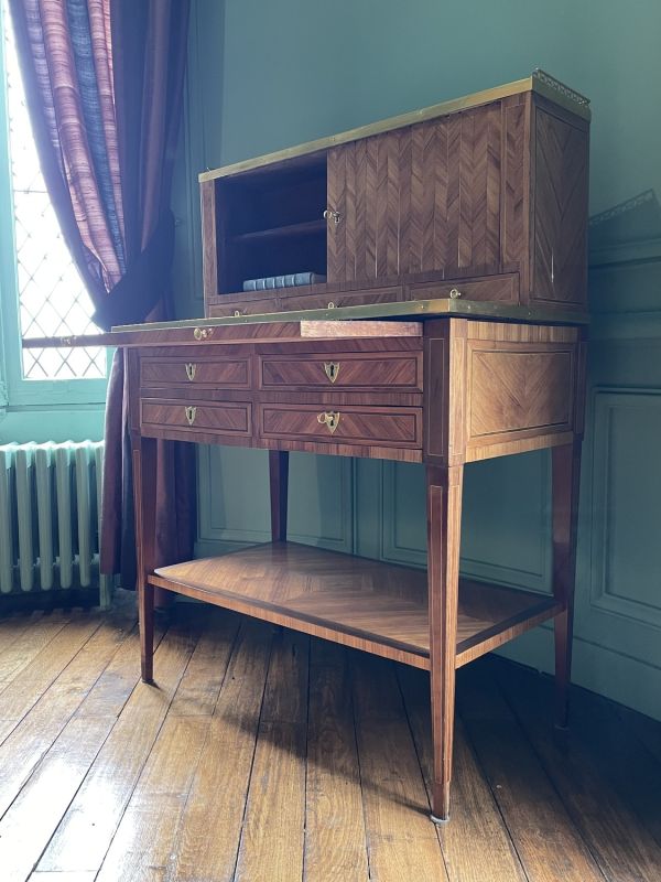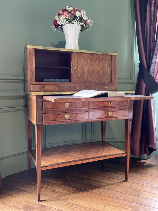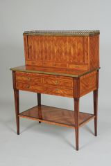 Bureau de dame dit "bonheur du jour" à décor de frisage et filets en bois de violette et buis, composé d'un cartonnier à galerie ajourée de bronze, rideau coulissant à lamelles marquetées en chevrons et reposant sur trois tiroirs, et d'une tablette avec quatre tiroirs en deux rangées à entrée de serrure en écu, le tout reposant sur quatre pieds en gaine reliés par une tablette d'entretoise.