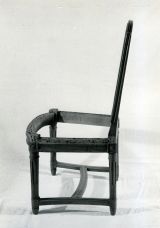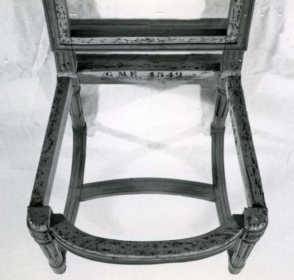 Chaise exécutée dans les années 1770-1780 par Jean-Baptiste-Claude Sené (1748-1803), menuisier-ébéniste, reçu maître à Paris en 1769. Dorée par la veuve Bardou (inscription manuscrite au pinceau)