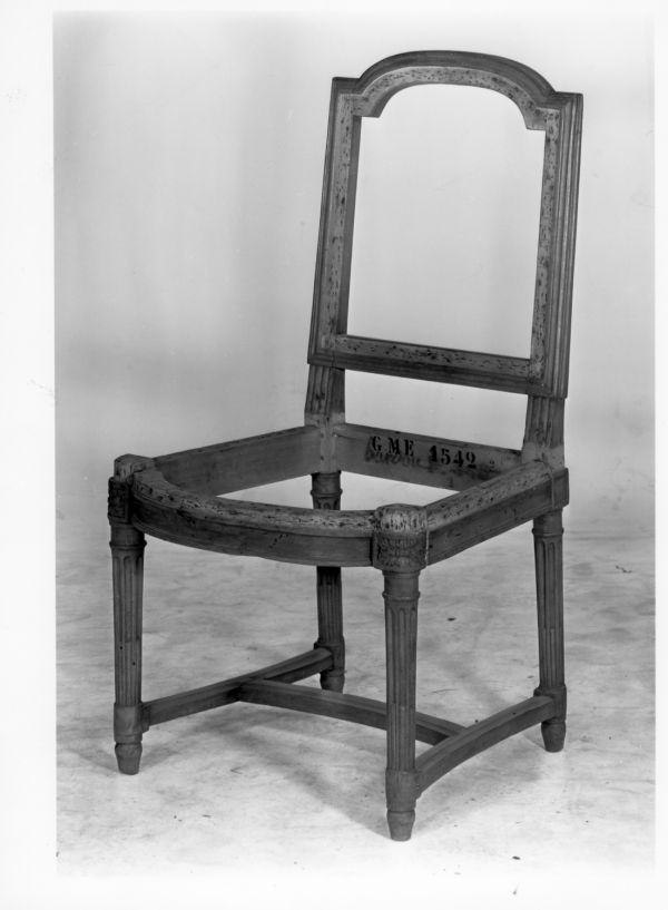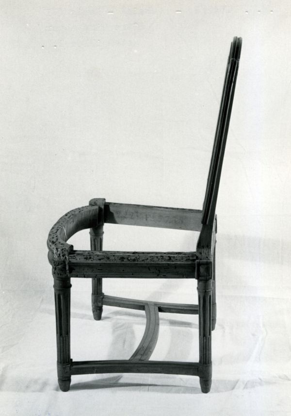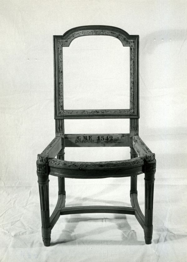 Présente sous Louis XVIII au palais de Fontainebleau (marque au fer) ; en 1839 (222 F 7735) ; en 1855 (F 14893). Rentrée au Garde-meuble, le 9 août 1870, dans une suite hétérogène de trente chaises (Arch. Mob. nat., M244, f° 61 v°, n° 44445).