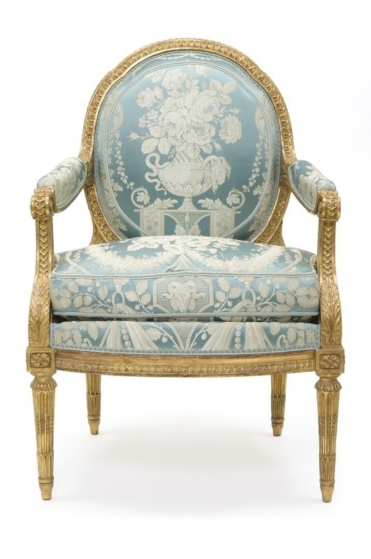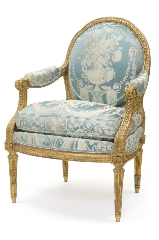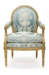 Pieds cannelés, ceinture raies de coeur et rosaces, accotoirs à feuilles d'acanthe, entrelacs et manchettes, dossier à médaillon, feuilles d'ornements et rubans. - Bibliographie