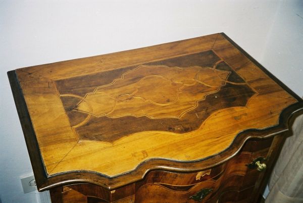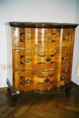 Pieds galbés, montants droits, ouvrant en façade à trois tiroirs à bouton en bronze doré, plan de la devanture chantourné dessus plein marqueté.
