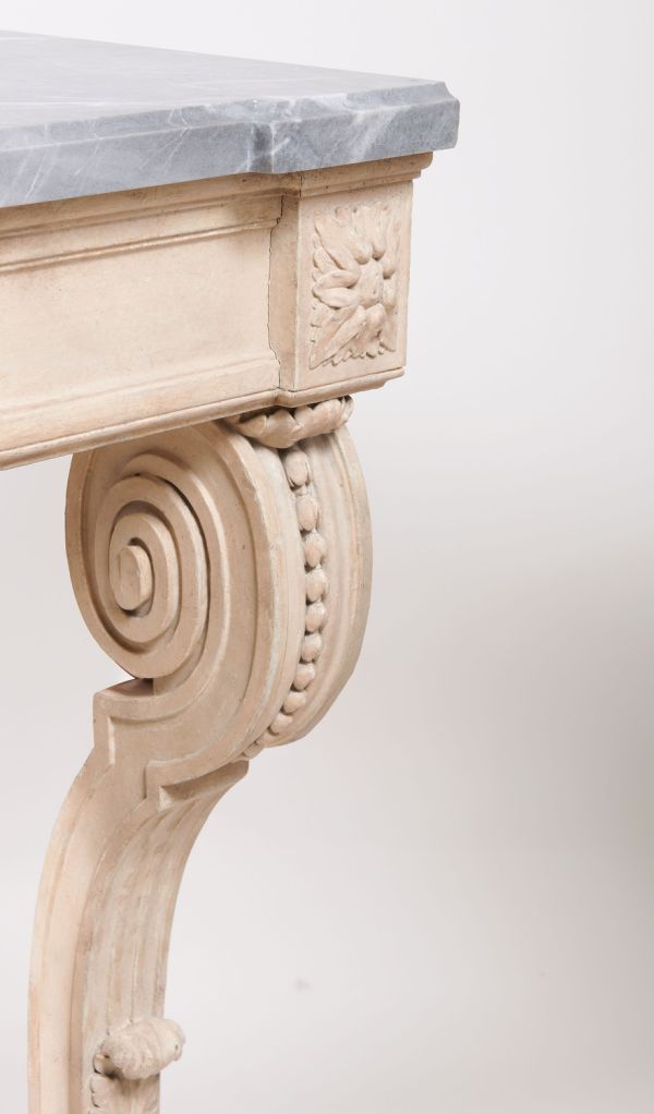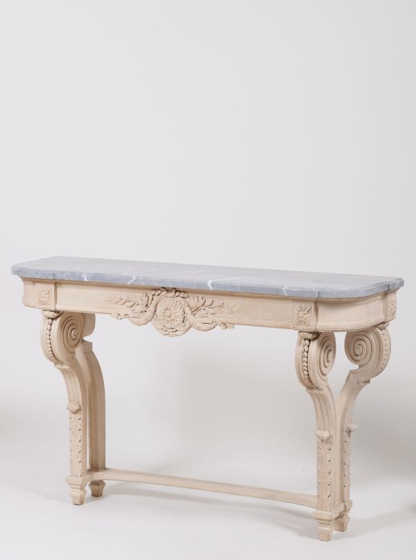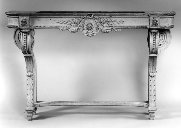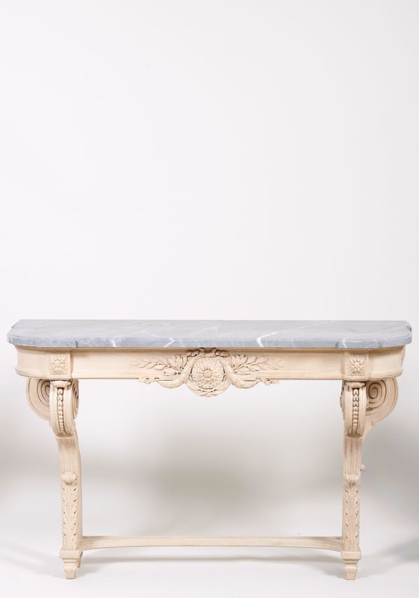 Sabots carrés, pieds antérieurs droits terminés dans la partie supérieure par un enroulement orné d'une feuille d'acanthe et de culots. Pieds arrières moulurés se terminant aussi par un enroulement disposé de côté. Devanture droite. Dés à rosaces de feuilles, au milieu de la devanture gr osse fleur attachée par des noeuds, tors de lauriers et branches de feuilles et fruits. Côtés arrondis. Dessus en marbre gris.