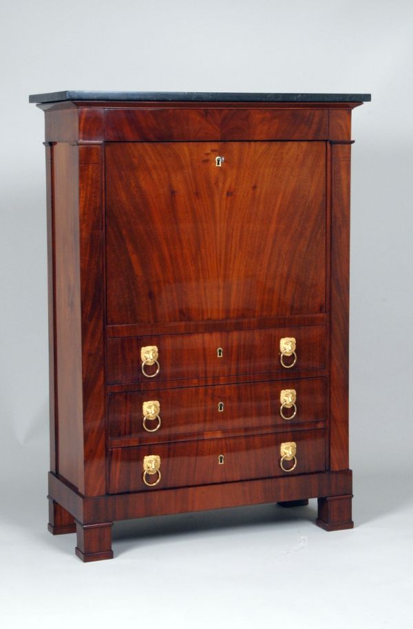 4 pieds cubiques. Montants rectilignes. 3 tiroirs. 1 abattant. 1 tiroir supérieur. Intérieur : dessus gainé cuir vert à vignettes or. 7 tiroirs, 1 niche, 1 tiroir toute largeur. Bronzes : 6 anneaux de tirage têtes de lion.