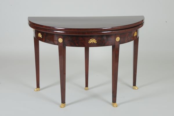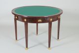 Cinq pieds gaine, griffes. Tirettes à l'aplomb dans la ceinture. Palmettes. Plateau divisé en deux parties. Velours vert.
