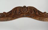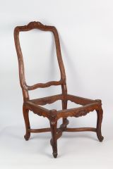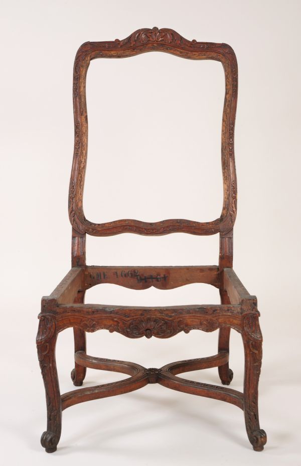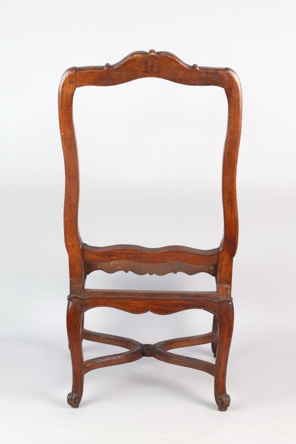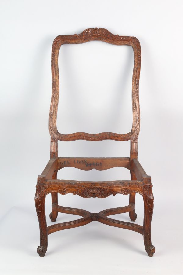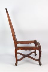 Dossier droit et dégagé, aux montants et traverses chantournés. Montants ornés d'une série de campanules. Décor de feuilles d'acanthe aux quatre angles du dossier ainsi qu'au sommet de la traverse supérieure.