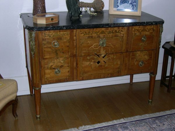 Commode à deux tiroirs sans traverse apparent, le centre formant léger ressaut. Au centre, un trophée de musique avec violon et autre instruments liés par un noeud. De chaque côté, deux trophées avec deux colombes dans du feuillage. Au dessus de chaque trophée, un bandeau avec marqueterie de rinceaux stylisés. Angles arrondis avec cannelures simulées en marqueterie, chutes de bronze doré. Les côtés avec marqueterie de vases de fleur. Pieds en gaine de section ronde à bague perlée de bronze et sabots. Dessus de marbre gris foncé.
