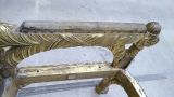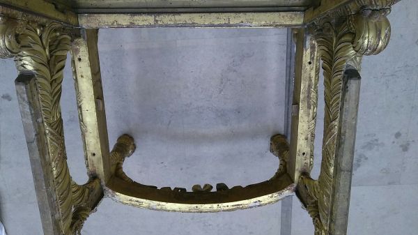 Bois doré. Pieds antérieurs en colonne cannelée à sabot griffes et enrobée de deux feuilles s'évasant en arc formant écoinçons sur la face et les côtés ; saillant sur la ceinture et formant supports d'accotoirs tournés à cannelures en torsade et base à feuilles à rouleau, sommet en chapiteau conique latéral coiffé demi-sphère à godrons. Pieds postérieurs sabre sans griffes même sculpture. Ceinture bombée sculptée de palmes enrubannées. Devanture convexe. Accotoirs droits raccord à rouleau posés sur deux arcs en demi-cercle, le tout à palmes enrubannées comme les montants du dossier de section circulaire adossés au cadre central mouluré et sculpté d'acanthes. Traverse supérieure très importante à cartouche central uni et porté par deux palmes de lauriers à rubans. Le reste de la sculpture est formé de deux bouquets de lys sur les montants, le feuillage couché rejoignant le cartouche. Siège et dossier à chassis encastrés. Siège, dossier, manchettes à garnir.