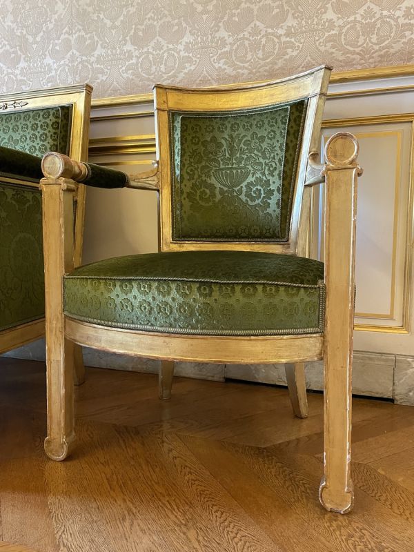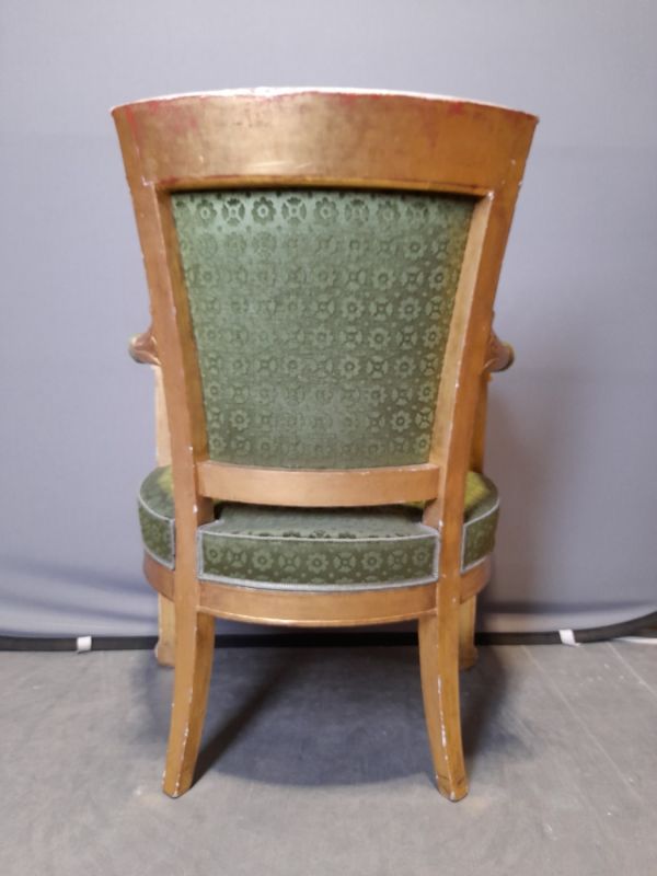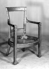 D'un ensemble dans les réserves du Mobilier national en 1894 : "10 bois de fauteuils dorés, style Empire, pieds semblables aux précédents [ceux de devant à glaives, ceux de derrière étrusques], ceinture id. [unie à moulures], accotoirs cintrés à rouleaux et manchettes, dossiers demi-?. L'un à 80 [francs]" (Mob. nat., registre d'inventaire des meubles garnis de tissu, vol. 1, p. 183, GME 1689 ; registre M69, p. 214).