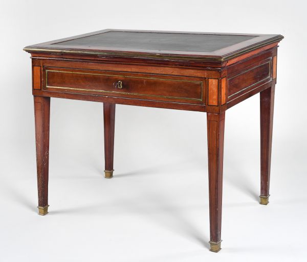 Quatre pieds gainés à filet d'ébène et sabots de bronze. Quatre réserves rectangulaires en ctironnier à même filet d'ébène. Filet de cuivre cernant chaque face, y compris le tour du tiroir en façade et ... de cuivre sur le pourtour. Dessus de cuir vert à vignette dorée.