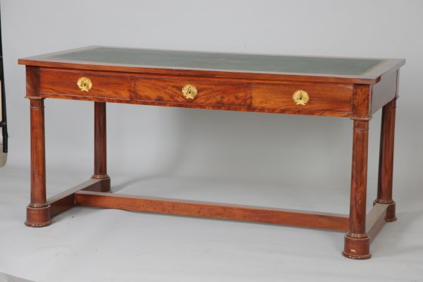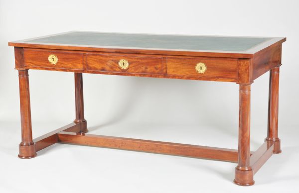 - Entrejambre rectiligne en double T. Quatre pieds en colonne unie à base et chapiteau mouluré une bague. Ceinture rectiligne à trois tiroirs entrée bronze double palme comme aux trois faux tiroirs. Dessus rectangulaire gainé cuir vert vignette or.