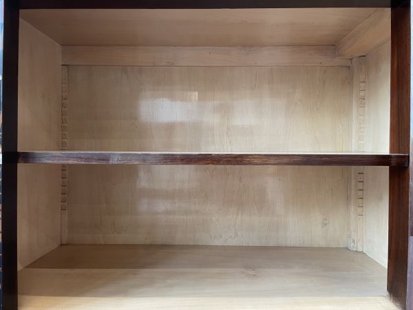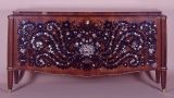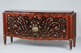 Deux portes pleines, partie inférieure galbée, entrée de serrure avec filet de cuivre, charnières saillantes large dormant légèrement en retrait haut ressaut plate en doucine légèrement en retrait - haut ressaut central évasé. Placage en palissandre de Rio. Façade marquetée d'ébène et de nacre, dessinant un bouquet central flanqué de trois larges volutes en éventail