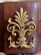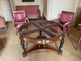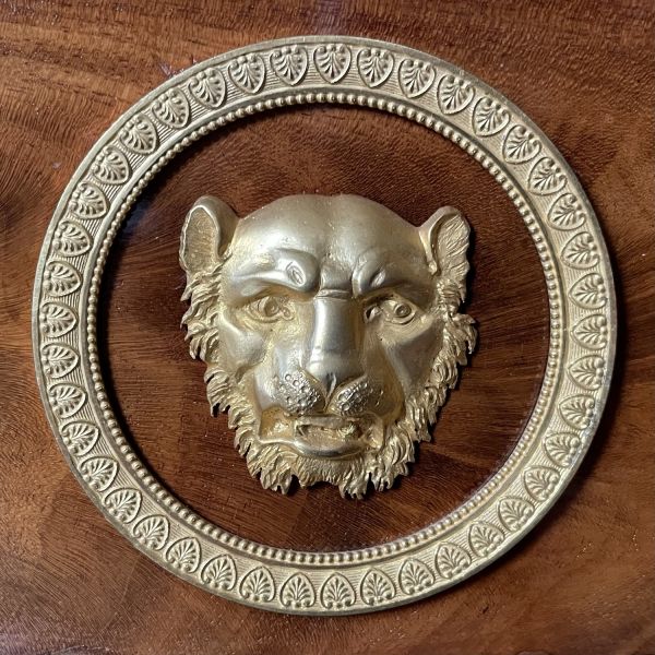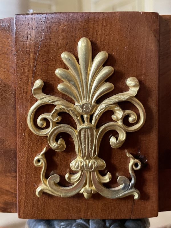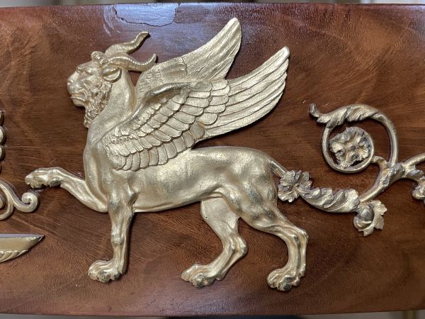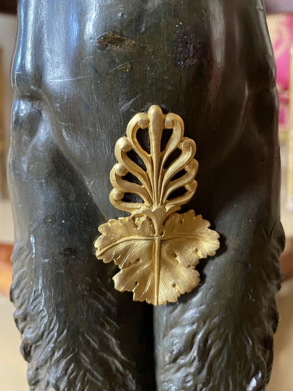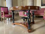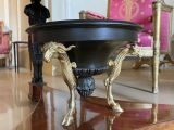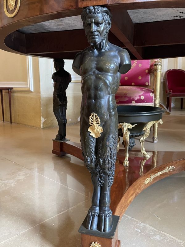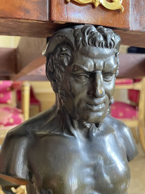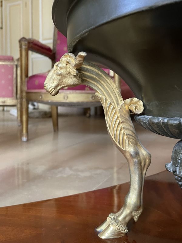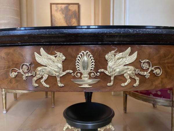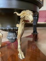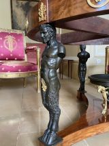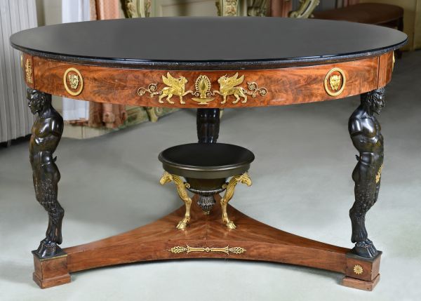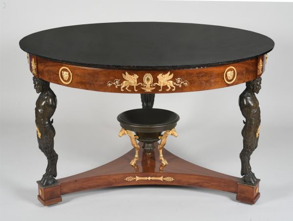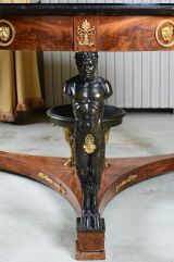 Socle triangulaire plein aux côtés incurvés décorés d'une double feuille terminée en palmette. A chaque pointe du socle, un cube avec petite plinthe orné sur trois faces d'une rosette de bronze doré et coiffé d'une plaque de bronze saillante. Reposant sur ces plaques. Les trois montants en forme de satyre sans bras de bois. Sculpté bronzé, avec feuille de vigne et palette de bronze doré. La ceinture du meuble, qui repose sur ces trois figures, est unie sauf à l'aplomb des têtes, où il y a une saillie légère, ornée d'une palmette de bronze doré; le reste de la ceinture est orné de griffons ailés supposés de chaque côté d'une coupe avec palmette, et de mufles de lionne dans un cercle moletté. Au centre du socle, une coupe de bois bronzé en forme de cul-de-lampe, dont le dessus est godronné et terminé par un fruit en graine. Le tout supporté par trois têtes de bouc naissant d'un jarret à sabot de bronze doré. Dessus de marbre granit noir à chanfrein inférieur.