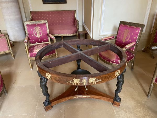 Ce guéridon n'est pas identifié dans l'inventaire des principaux appartements du palais des Tuileries. Cependant, la marque au fer atteste de sa présence au palais consulaire en 1800.
