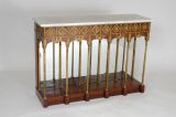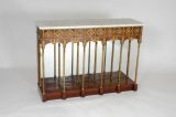 Socle rectangulaire à 6 dés saillants en façade pour supporter 6 montants bronze en colonne tournée. Socle moulure chapiteaux feuilles d'eau, répétées sur le fond en glace en demi-colonne et gros pilastre bois côtés et postérieurs. Ceinture unie chantournée en double doucine face et côtés entre chaque colonne et bordé listels bronze en applique avec palmette centrale étayée de volutes. Frise supérieure faite de carrés sur angle, en applique bronzes à rosaces centrales en applique et séparés d'un macaron à 2 culots feuilles verticaux entre 2 listels bronzes en applique une palmette bronze verticale à chaque colonne. Dessus marbre blanc rectangulaire.