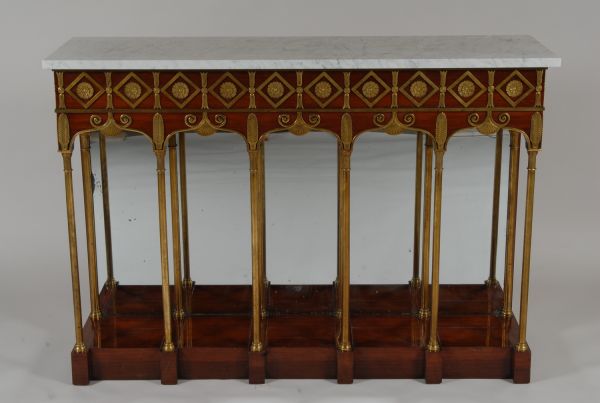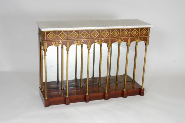 Console exécutée par la société « Jacob Frères », association de Georges (II) Jacob (1768-1803) et de son frère, François-Honoré-Georges Jacob (1770-1841), menuisiers-ébénistes, active de 1796 à 1803. Le dessin peut avoir été donné par les architectes Charles Percier (17641838) et Pierre-François-Léonard Fontaine (1762-1853).