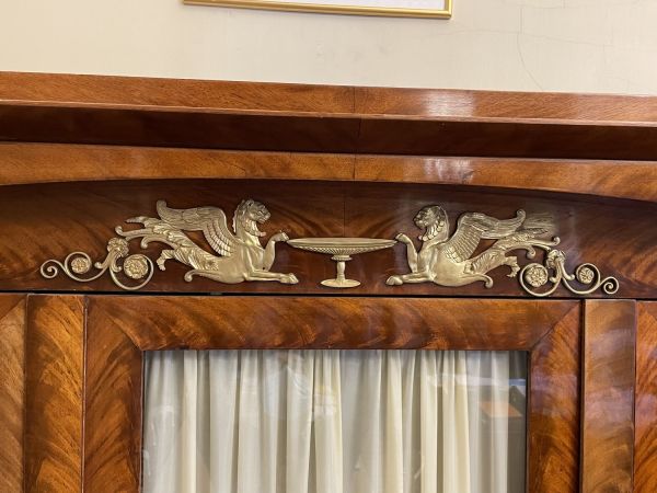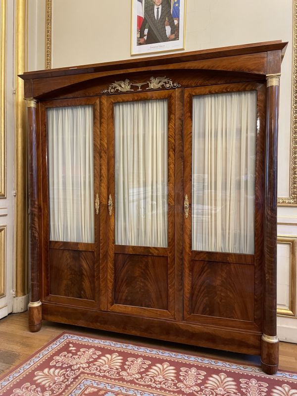 Bibliothèque d’époque Empire avec trois portes vitrées, en bois d’acajou.