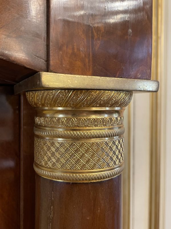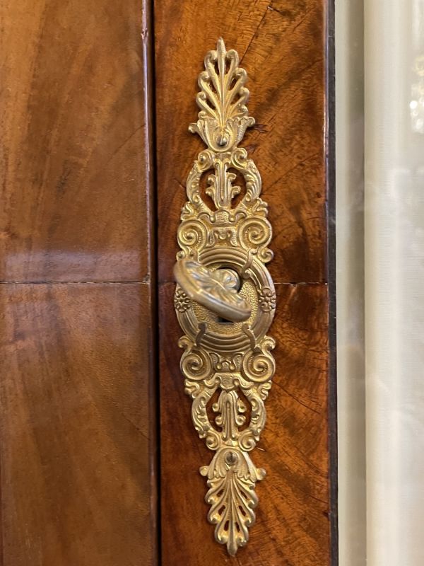 Devanture droite deux colonnes dégagées à base et chapiteau de bronze flanquant trois portes bas à fond creux haut vitré entrées de serrure en bronze à palmettes découpées.