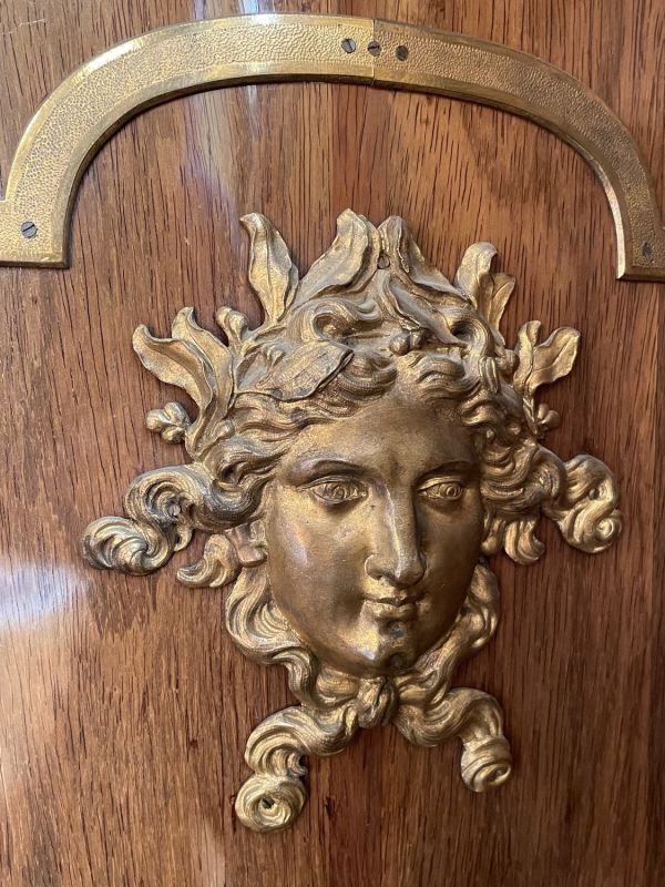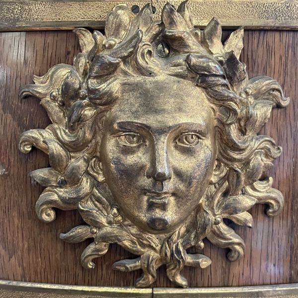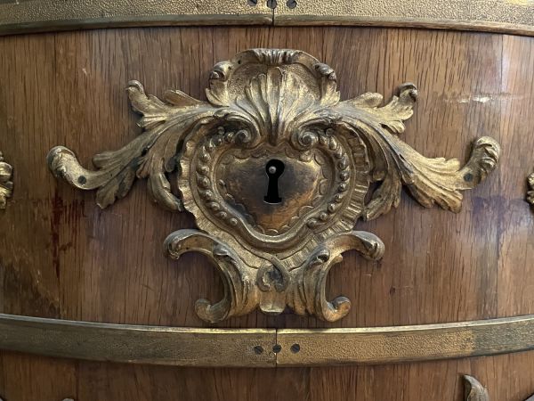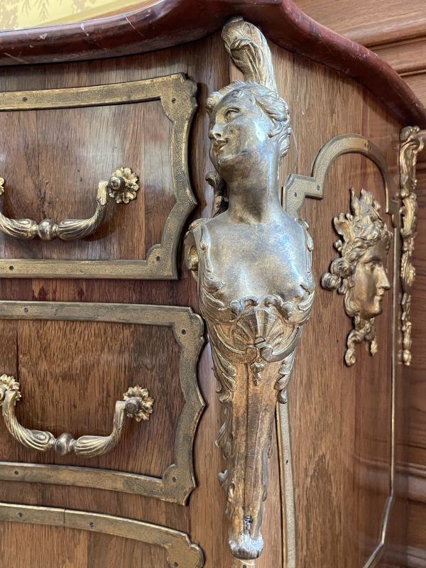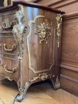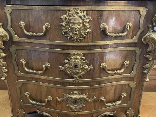 Commode à trois tiroirs, galbée toutes face, chaque tiroir enrichi de bronzes dorés, poignées et entourage en bandeau mi plat, le tiroir inférieur orné d'un cartouche à coquille, le tiroir médian est orné d'une cartouche à chimères, au centre du tiroir supérieur riche mascaron à tête laurée (Apollon ou Daphné ?). Les deux tiroirs inférieurs ferment à clef.