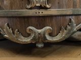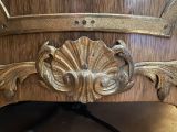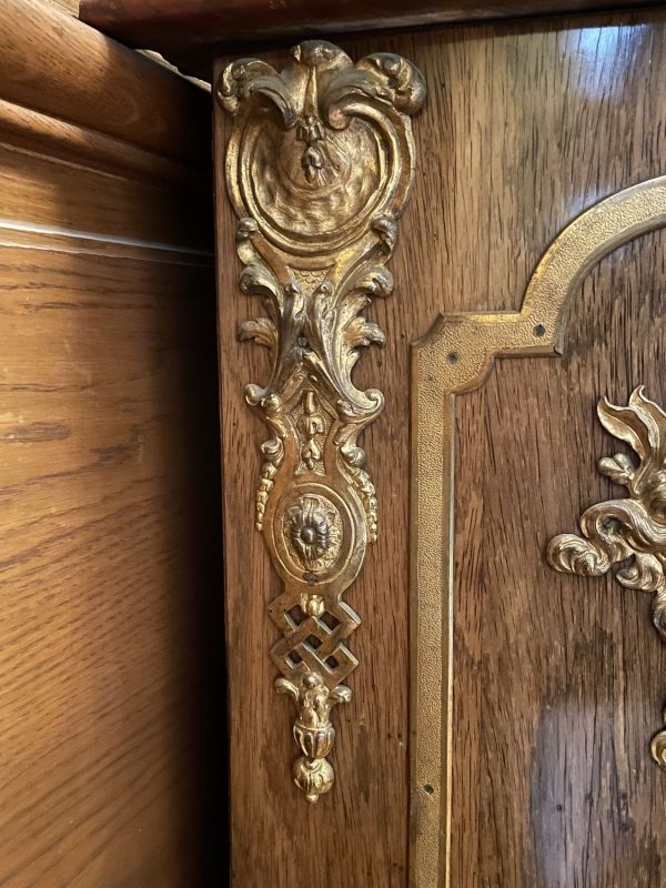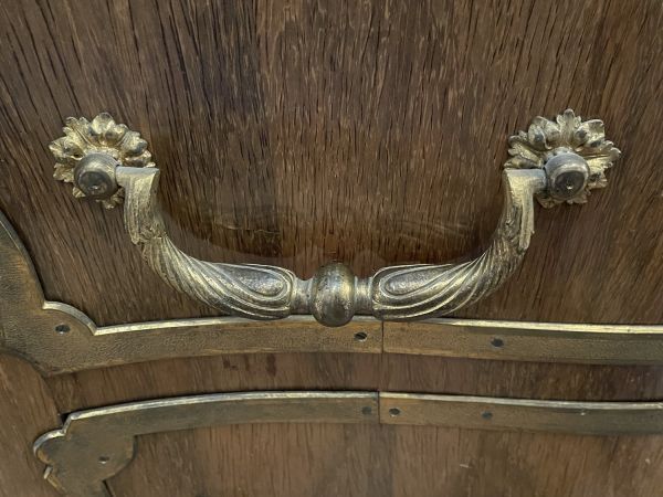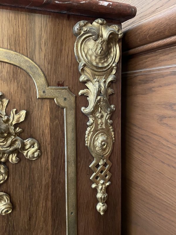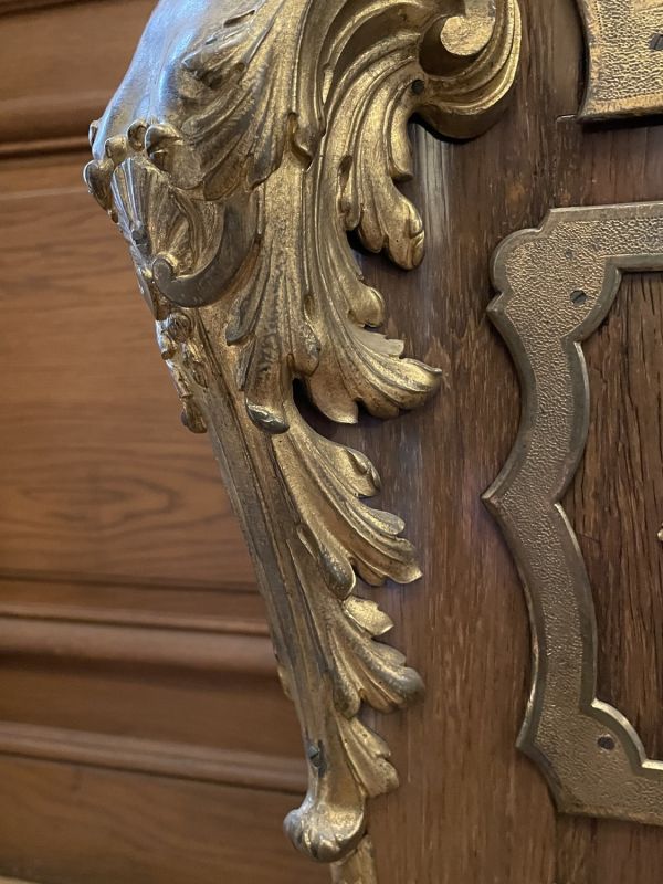 Sur les montants arrières, chutes de bronzes ajourées et sabots en applique à feuillage et enroulements.