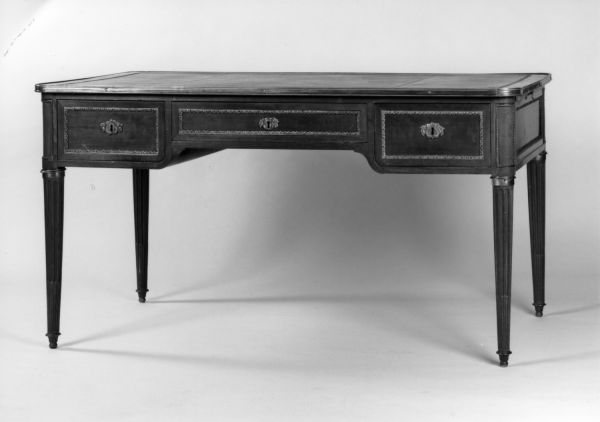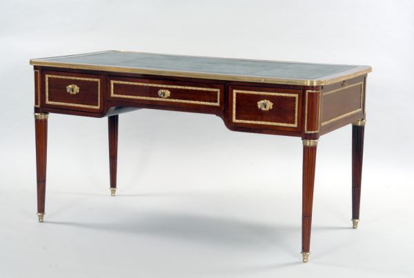 Bureau plat à angle arrondis ceinture d'une galerie de bronzes doré, le tiroir central encadré et les deux tiroirs en caissons sont soulignés d'une frise de bronze, en encadrement et enrichi entrées de serrures de bronze ciselé de feuilles de chêne. 4 pieds ronds forme fuseau, cannelés et rudentés terminés par un sabot de bronze doré.