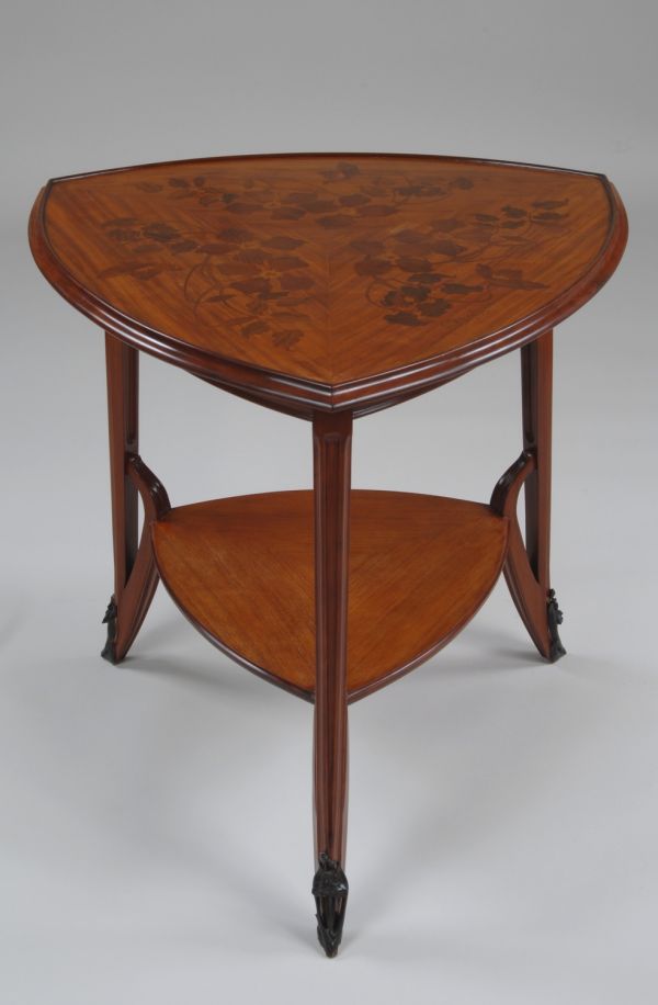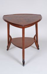 Plateau en acajou et satiné, de plan triangulaire à côtés convexes, marqueté sur un fond de satiné, 3 branches de clématite identiques, léger rebord en acajou mouluré saillant, en retrait ceinture raccordée à 3 pieds moulurés terminés par un sabot de bronze à décor de jonquilles et de feuilles. Un retour à l'intérieur du pied, en coup de fouet maintenant une tablette inférieure entrjambes.