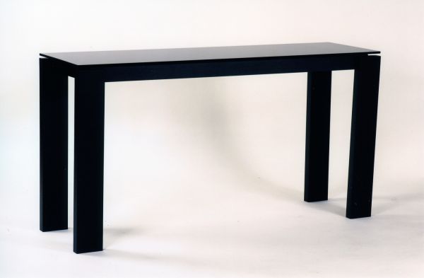 - Console basse en placage de chêne teinté wengé sur médium, 2 plateaux en verre trempé laqué noir.