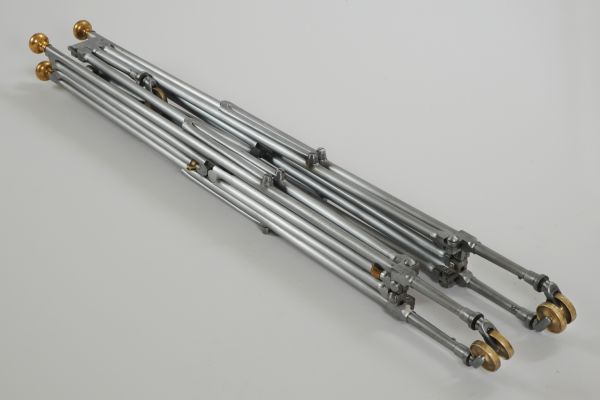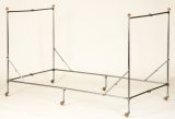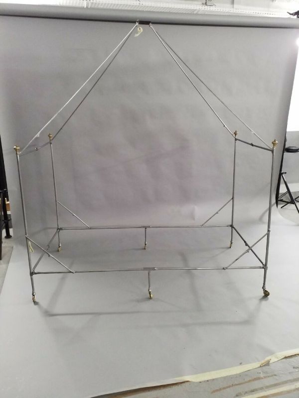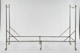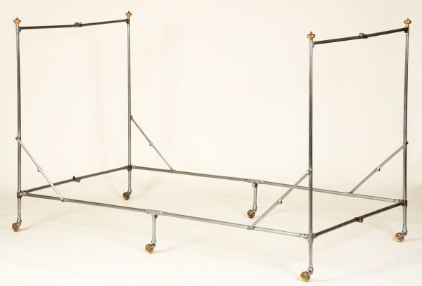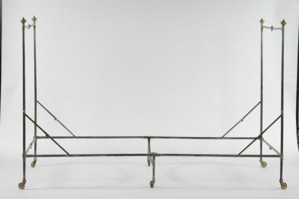 Ce lit de fer, entièrement pliable grâce à ses nombreuses charnières est fait d’une seule pièce. Lorsqu’il est déployé, les articulations sont bloquées par des bagues coulissantes. Il est muni de six pieds à roulettes en laiton doré. Les chevets du lit sont symétriques et chaque montant vertical est surmonté d’une toupie de cuivre doré qui se visse et se dévisse pour installer ou enlever le dais GME 17812/1.