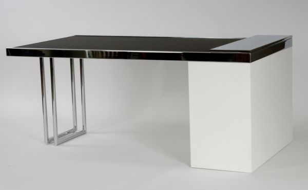 La table s'étend à la longueur voulue entre 1m75 et 3m grâce à un système de lattes enroulables qui coulissent sur des glissières de soutien. La table se compose de 3 éléments: double chevalet en acier chromé sur un côté de la base, élément rectangulaire en bois laqué en blanc mat et accueillant le plateau déroulant de l'autre côté, plateau recouvert d'un matériau technique lavable noir
