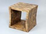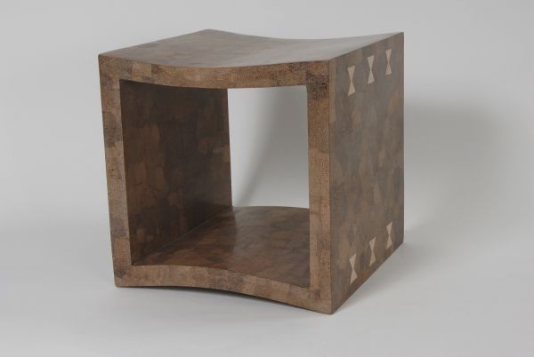Bois, laque végétale coquille d'oeuf beige. Parallélépipède à côtés convexes (usage tabouret) laqué beige. Sur le plateau 6 motifs de bobines en laque ivoire