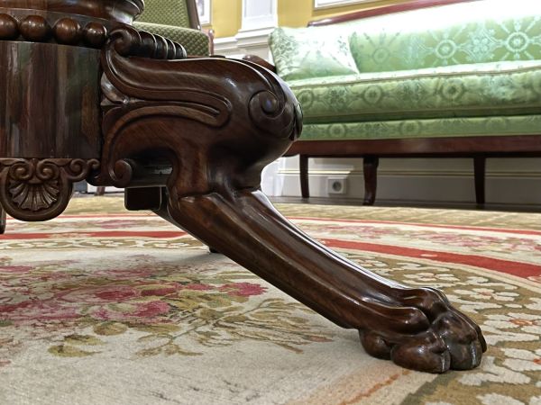 Piètement formé de quatre jarrets de fauve repliés avec volutes à leur base. Fût cylindrique à grosse bague : base surmontée de perles et terminée par un décor de joncs espacés entre les quatre pieds.