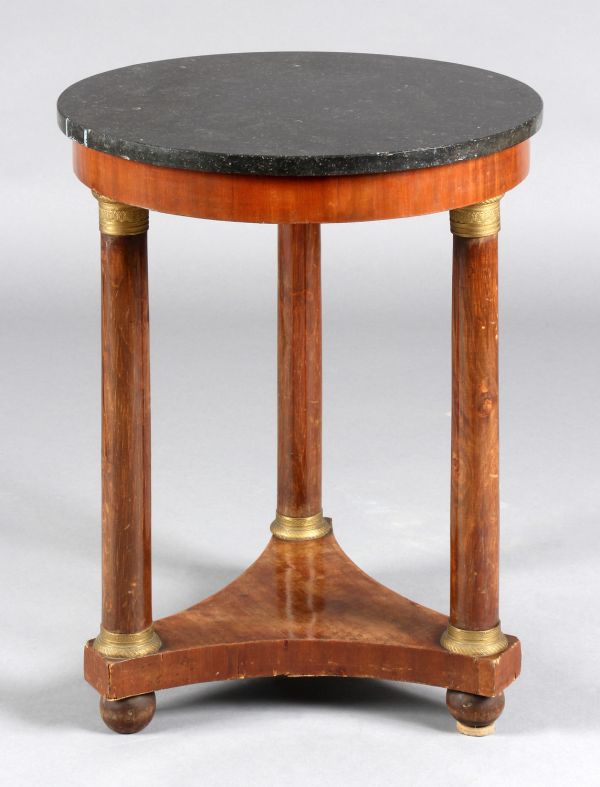 - Tripode. Pieds en colonne, entretoise, ceinture, plateau de marbre granit; bases et chapiteaux en bronze doré