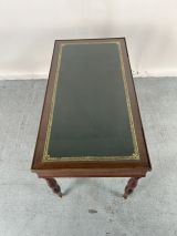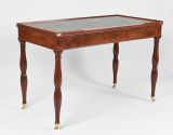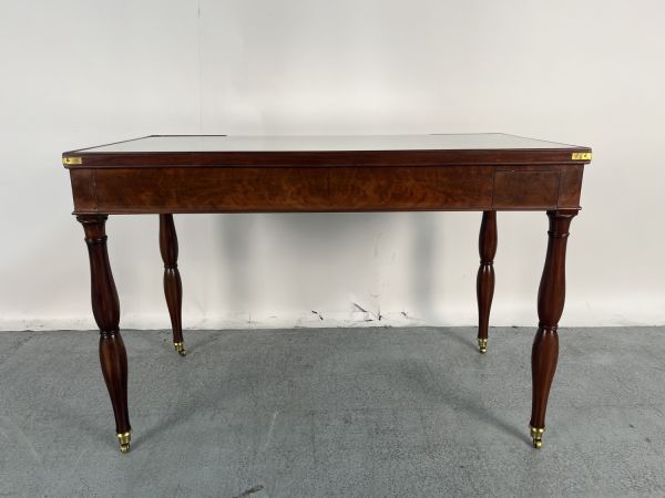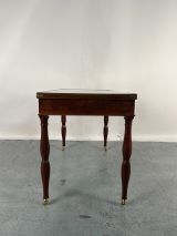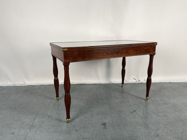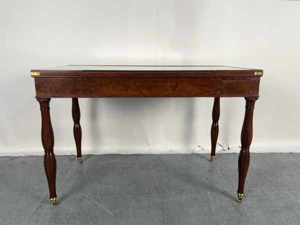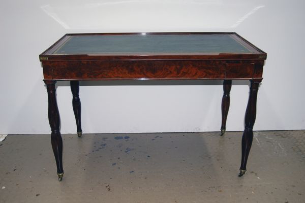 Dessus rectangulaire plein à frise et gainé, petit bord jonc élégi sur une partie de la face antérieure. Autre dessus mobile à retournement à frise une face gainée drap vert et bordée jonc sur les quatre côtés, l'autre face avec jeu de tric trac. Bois noir incrustation os naturel et teinté vert.