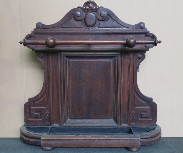 En lambris d'appui, parties moulurées avec table, fronton en accolade, barre de retenue fixée par trois pitons, réceptacle saillant doublé de métal.