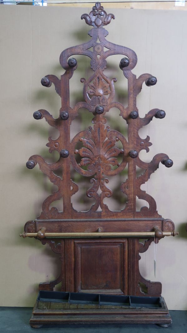En lambris de hauteur, partie supérieure découpée à jour, à 12 patères (certaines manquantes); partie inférieure avec table flanquée de consoles profilées, barre de retenue fixée par trois pitons, réceptacle saillant doublé de bac en métal.