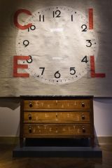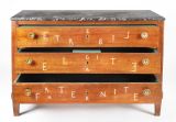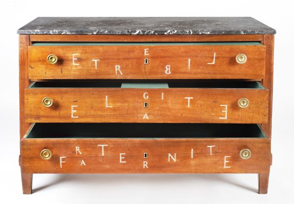 L'œuvre est gravée sur chacun des 3 tiroirs de l'expression "Liberté, égalité, fraternité par le graveur sur bois français, Victor Bert (qui a signé le pied avant gauche de son chiffre VB)", l'intérieur garni de rangements par le cartonnier londonien Piotr Jarosz.