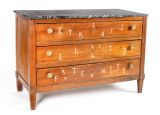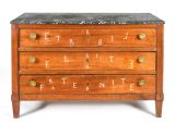 4 pieds carrés en gaine. Montants carrés à dés unis saillants, les antérieurs à arêtes à carré. 3 tiroirs entre traverses moulurées, entrée à filet saillant et 2 boutons cuvette bronze moleté.