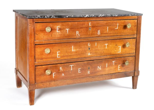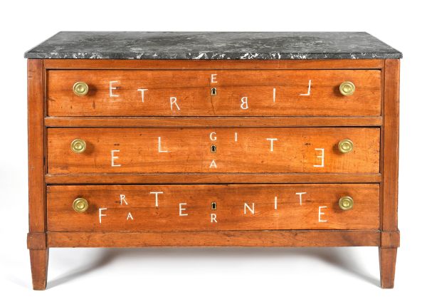 Dans un aller-retour entre l'Histoire et l'avenir des savoirs faire, l’artiste a cherché à conserver à ce meuble, et au grand jour, son histoire d’appartenance à l’État qui dicte les lois inaliénables ! La sculpture des lettres, à l’image des anciennes marques au feu du Garde-meuble, creuse en profondeur la façade des tiroirs, telle une balafre historique. Les mots qui y apparaissent par extraction, transforment cette marque d’infamie en marque valorisante affirmée par le soin d’une argenture à la texture raffinée. Ce geste propulse notre artiste vers les démons de son coming out, ou l’acte de graver dans le tiroir d’une table libérait l’adolescent de son secret en l’affirmant clairement.