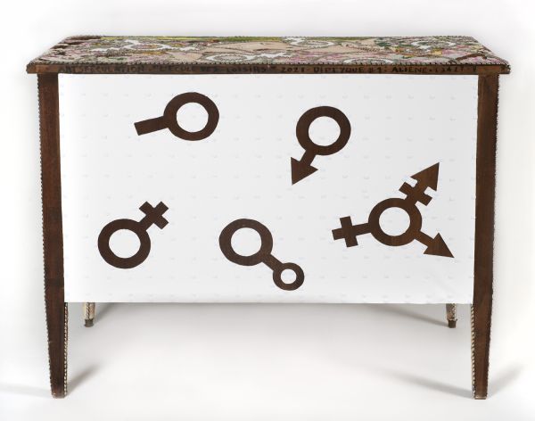 Cette commode ainsi que la commode GME 18734 recèlent dans les profondeurs de leurs tiroirs un véritable inventaire à la Prévert qui pourrait porter à sourire s’il n’était le reflet déterminant de valeurs culturelles et sociétales qui semblent obsolètes, sinon périmées, après avoir néanmoins codifié, avec quelque rigueur, le genre humain. L’intérieur de chacun des tiroirs contient une série d’objets symbolisant chaque catégorie. Jusque dans leurs aspects extérieurs, ces meubles forment désormais une vraie fausse paire Homme/Femme tout en posant la question du transgenre. Ces commodes sont un véritable point d’interrogation sur la question du devenir et se situent entre art brut et objet de mémoire de valeurs en constante révision et évolution.