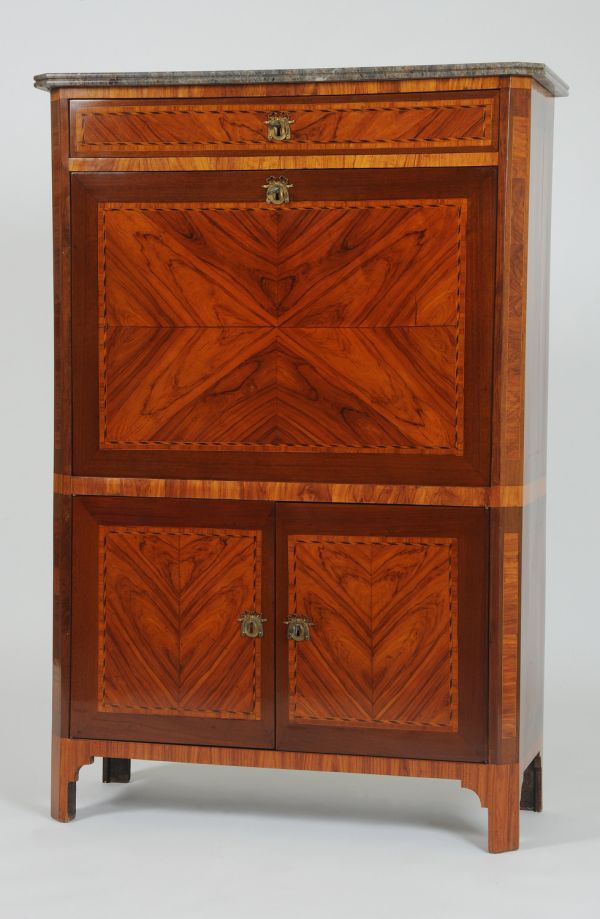 Pieds droits à écoiçon concave, côtés unis formant montants en pans occupés plaqués représentant 2 panneaux à filets ébène et buis séparés par traverses bois de rose pans coupés bois de rose en travers filets buis. 2 portes-joint vif centre frise bois de rose à filets ébène et buis, entrées cartouche à guirlandes et rubans. Abattant même frissage et même frise gainé maroquin vert vignettes or. Intérieur 6 petits tiroirs et niche centrale bois de rose à frise et boutons bronze tourné. 2 niches supérieures la première à séparation. 1 tiroir supérieur à clé entrée.