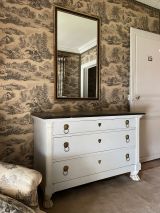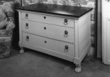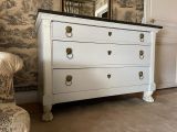 Pieds antérieurs en griffes sculptées, postérieurs carrés. Pilastres droits. Panneaux de côtés unis. 3 tiroirs clés. Bronzes : tête de lion et anneaux unis. Marbre granit rectangulaire à angles vifs.