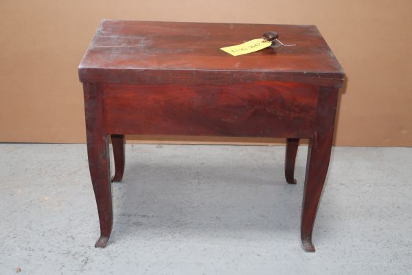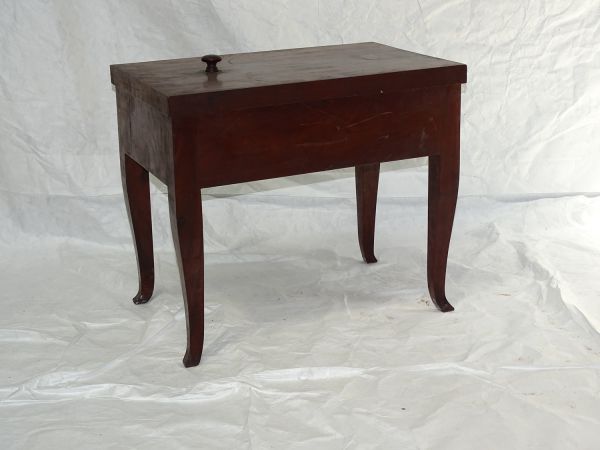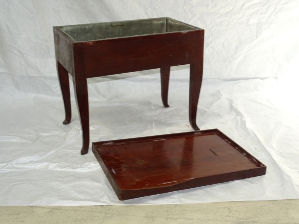 4 pieds carrés galbés. Coffre rectiligne garni zinc à l'intérieur avec cuvette mobile en étain rectangulaire arêtes intérieures arrondies et 2 poignées latérales (fer). Dessus saillant emboité rectiligne à petite lunette trapézoïdale & une extrémité et un bouton bois tourné à l'autre extrémité.