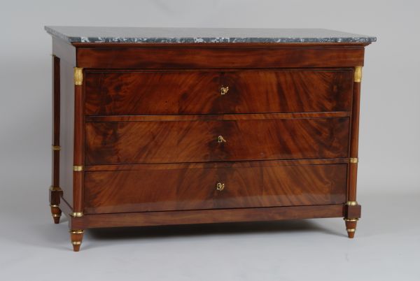 Pieds toupie cerclés bronze, supportant en façade socle rectiligne saillant en dés pour 3/4 de colonne, efffilée à chapiteau, base et bague bronze. Montants postérieurs carrés en pilastres bagués, 4 tiroirs dont 1 formant ceinture, bandeau rectiligne supporté par les colonnes, corniche saillante. Dessus marbre Sainte Anne.