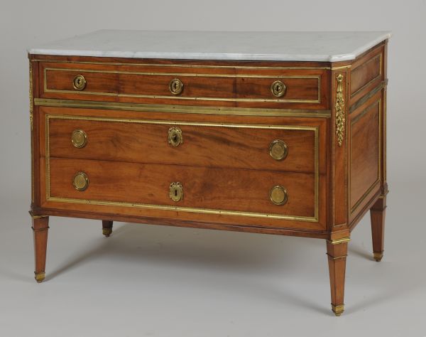 Quatre pieds carrés en gaine, sabot bague et sommet en moulures bronze, les deux antérieurs d'angle. Petite ceinture à carré supérieur. Montants à fond creux bordé perles, les antérieurs en pan coupé et à chûte de fleurs en bronze. Côtés en deux panneaux à frise, moulure bronze intérieure à perles. Deux tiroirs ne figurant qu'un panneau à frise et moulures perles, entrée médaillon ovale à perles, ruban et lauriers, deux anneaux tombants, encastrés sur paltine tournée, astragale, moulure unie bronze. Trois tiroirs ne formant qu'un panneau de toute largeur à moulure perle et trois anneaux sur platine tournée à perles et formant entrées. Traverse saillante en corniche sur moulure bronze uni.