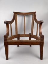 Supports d'accotoir en cavet, de section semi-circulaire et ornés d'une fleurette inscrite dans un cercle à la base. Accotoirs filants avec les montants du dossier. Têtes en volute.