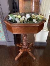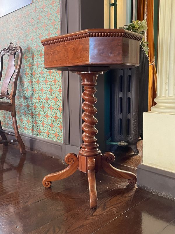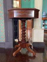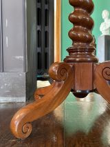 Quatre pieds en consoles chantournés et terminés par des sabots à volute, autour d'un fût octogonal à base et sommet moulurés de section circulaire.