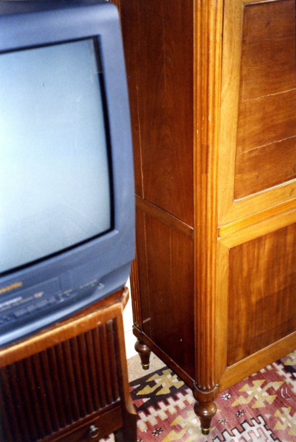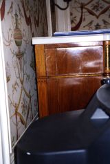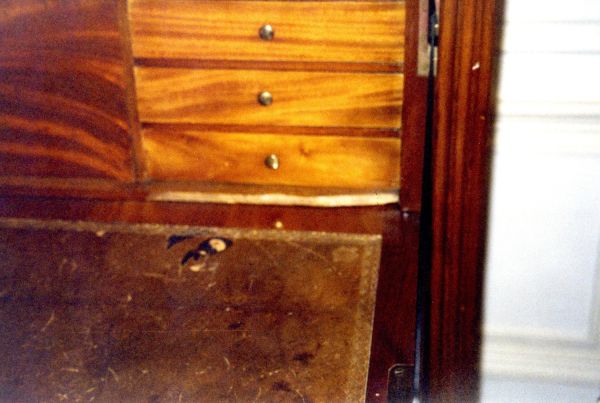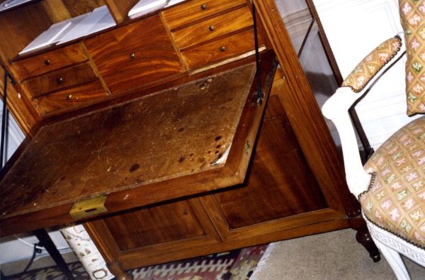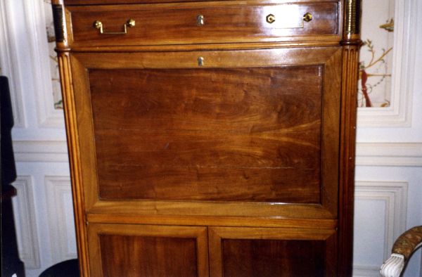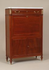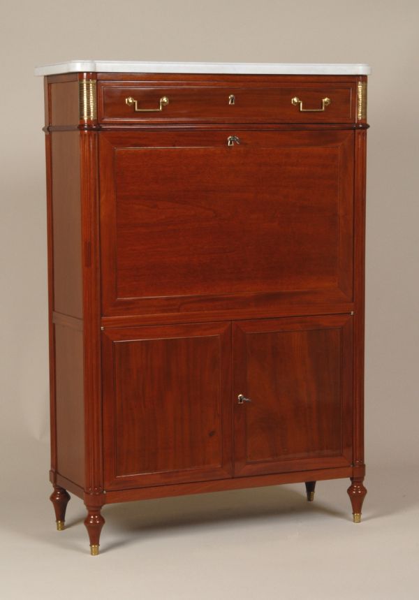 4 pieds toupie, sabot bronze. Montants cannelés, les antérieurs ronds et saillants avec sommet en platine bronze azuré et après astragale moulurée. Côtés à traverse centrale saillante, comme celles de façade. 2 portes d'un panneau encadré frise saillante à arrondi intérieur. 1 abattant d'un panneau et même frise, un tiroir supérieur à petite frise saillante. 3 serrures trèfle et filet saillant, 2 poignées rectangulaires pendantes et à facettes sur platines hexagonales. Dessus marbre Ste Anne saillant, chantourné et à congé. Intérieur gainé cuir beige, 7 tiroirs, le central triple, à bouton bronze et sous niche à une tablette et une séparation