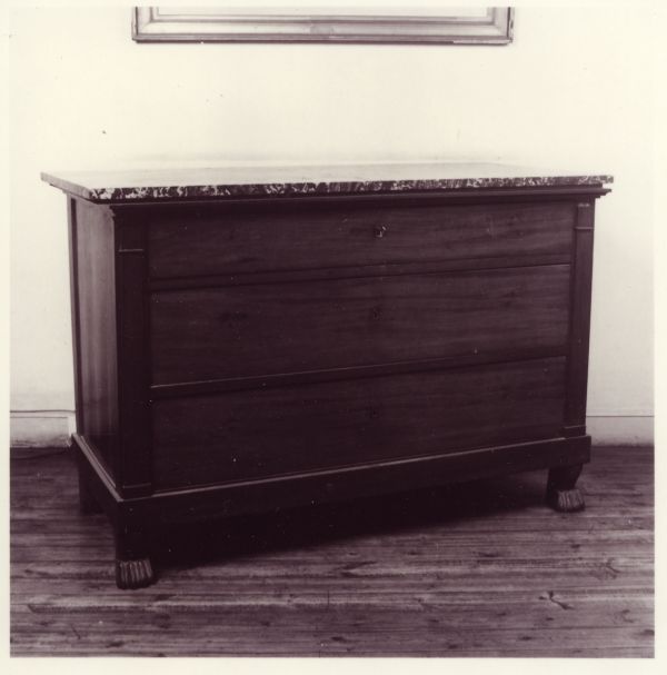 Montants carrés à pilastre. Pieds antérieurs bronzés à griffes. 3 tiroirs fermant à clé. Dessus marbre granit